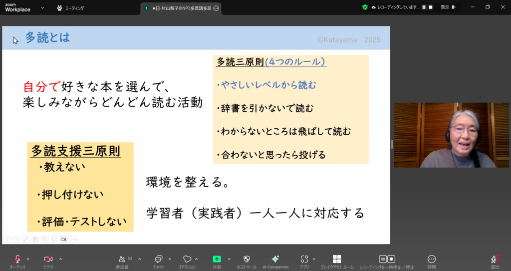 日本語支援者の片山智子さん(NPO多言語多読正会員・東京大学)から、「おさらい」として「多読とは」「多読支援とは」が説明されました。多読三原則や4つのルール、そして多読支援三原則は短いことばで表現されていますが、それぞれどのような意味をもつのか、ていねいに解説されました。初めて参加した方にも、毎年のように参加されるリピーターの方にとっても、あらためて原点に立ち戻ることができる時間だったのではないでしょうか。