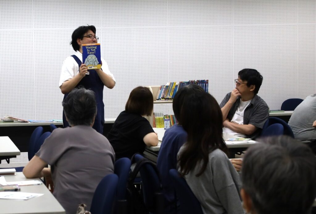 私も先生からおすすめの英語絵本について話を振られ、Mo WillemsのElephant & Piggie Bookより「Waiting Is Not Easy!」を熱く語ってしまいました。