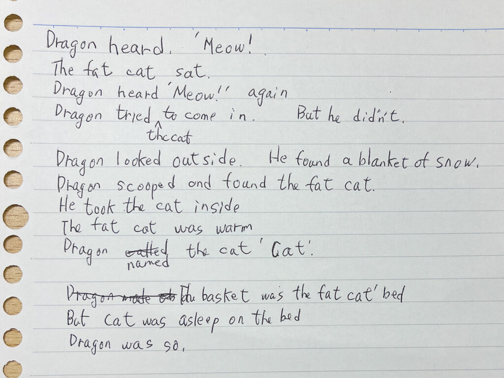 最初は案外むずかしいのですが、「ひと口大」に収まる大きさで言えるようになってくると、聞いていてすっと伝わってくるので「元の文がそうだったんじゃないか?」という気がしてきます。でも実際には、Dragon’s Fat Cat の元の文は、Hさんのメモよりも長い文が並んでいます。なお、「正しさ」は例によって一切問いません!