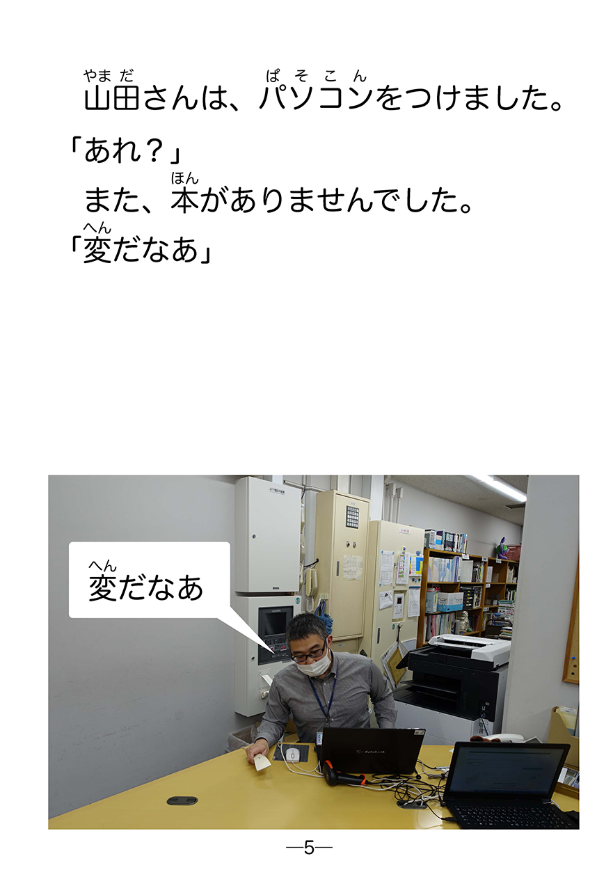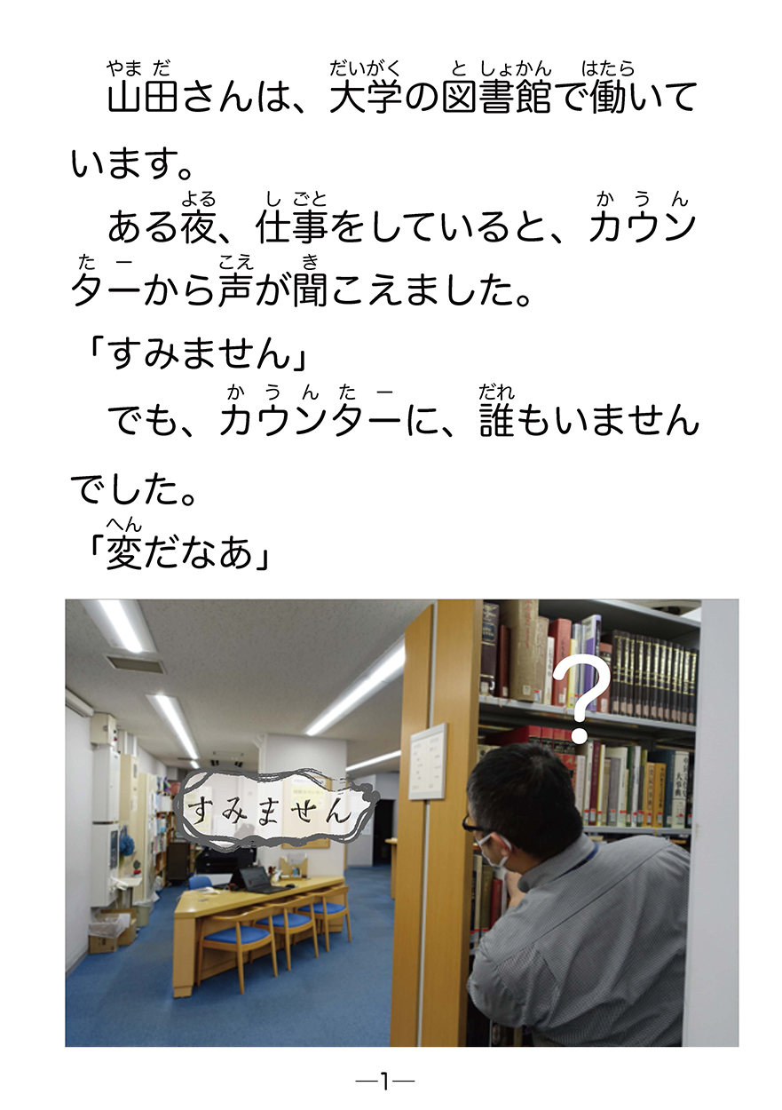夜、図書館の人が仕事をしていると、不思議なことが起こりました。何回も誰かが本を返しに来るのですが、本はすぐ消えるのです。その理由は…。聖学院大学の学生が作りました。