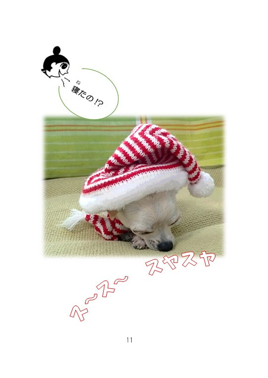 チワワの花すけは、お姉さんに帽子とマフラーを編んでもらいました。花すけはうれしくて飛び跳ねます。