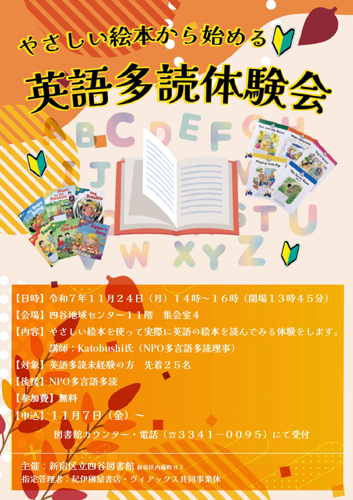 11月24日、新宿区立四谷図書館主催の「英語多読体験会」が開催されます。