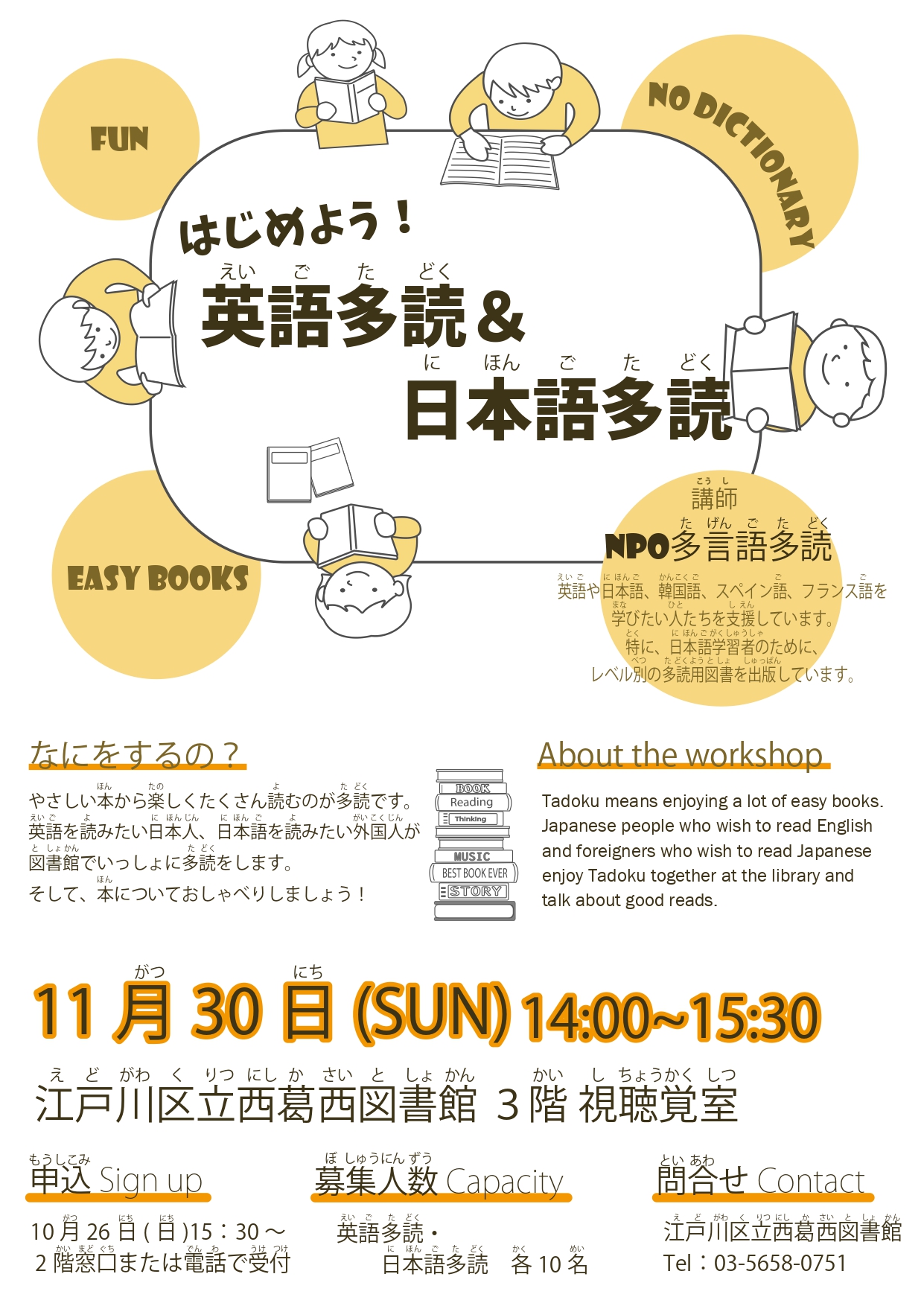 NPO Tadoku Supporters will be assisting. Please do come along and enjoy reading!